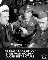 The Best Years Of Our Lives, is a 1946 American drama film directed by William Wyler. The film is credited for its portrayal of the hardships of the post-war era and reincorporation of men into society after their traumatic terms in the US Military. It stars Frederic March, Myrna Loy, Dana Andrews, Teresa Wright, Virginia Mayo, and an amazing performance by Harold Russell.