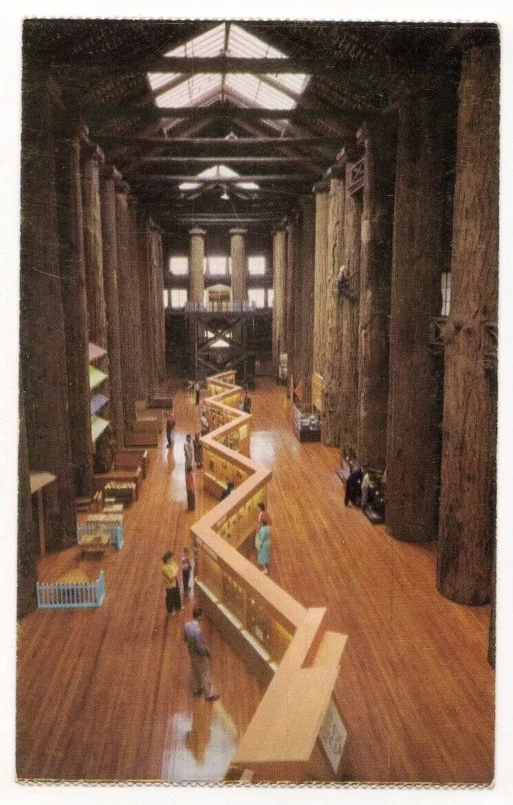 At one end of the building, reaching up almost to the ceiling was a replica lookout tower, with stairs climbing up to the tiny cabin at the top. It was scary being up so high. As an adult, I wondered how high it really was. Now I have come across a bunch of photos of the place both inside and out and it was huge! Maybe even bigger than what I have imagined all these years later.